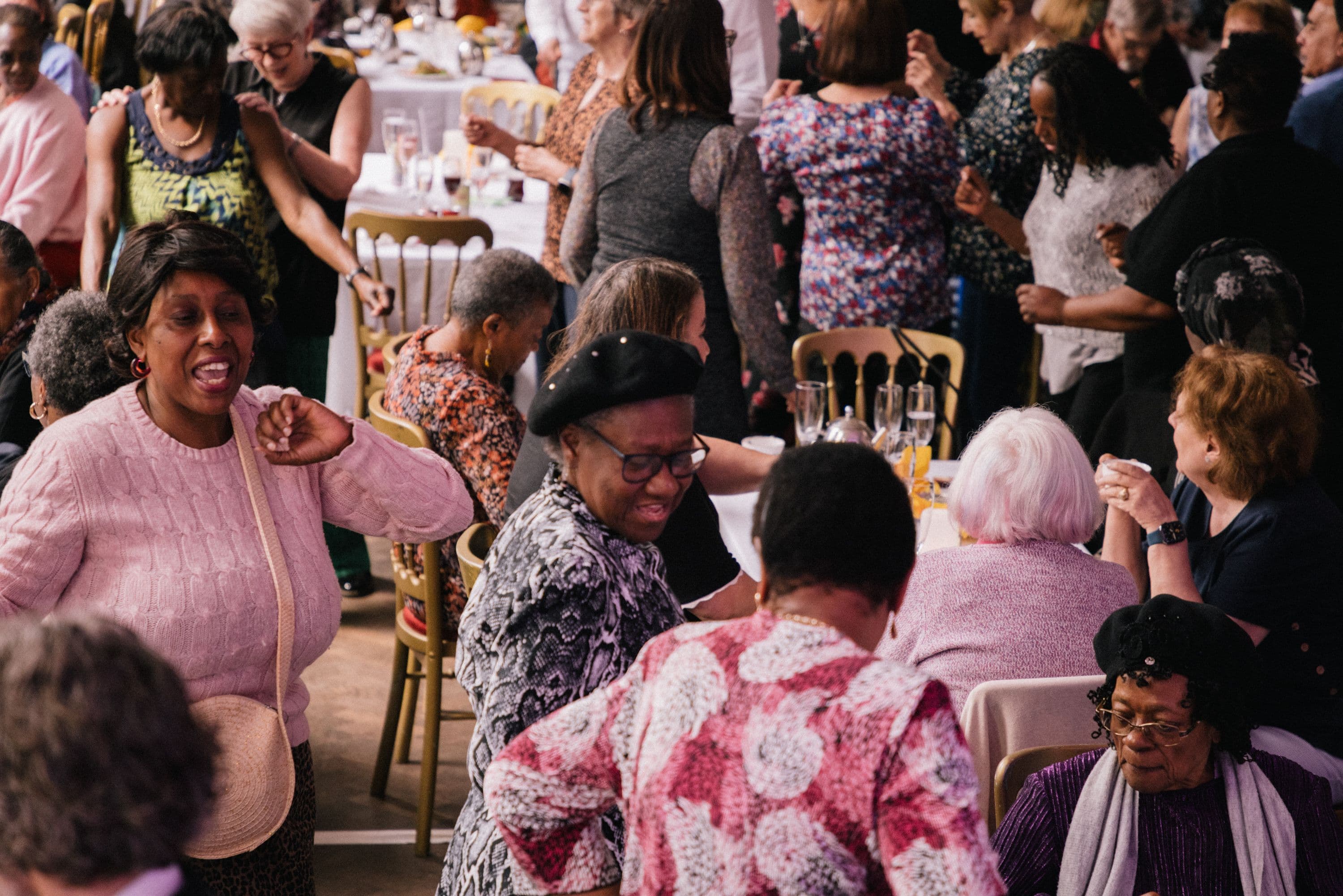 Photos capturing the Posh Club which is a glamorous performance and social club for people aged 60+ . It is held in transformed community venues across London and the South East. Inspired by 1940s afternoon tea it features vintage crockery live music homemade cakes and dazzling performances including cabaret drag and dance.